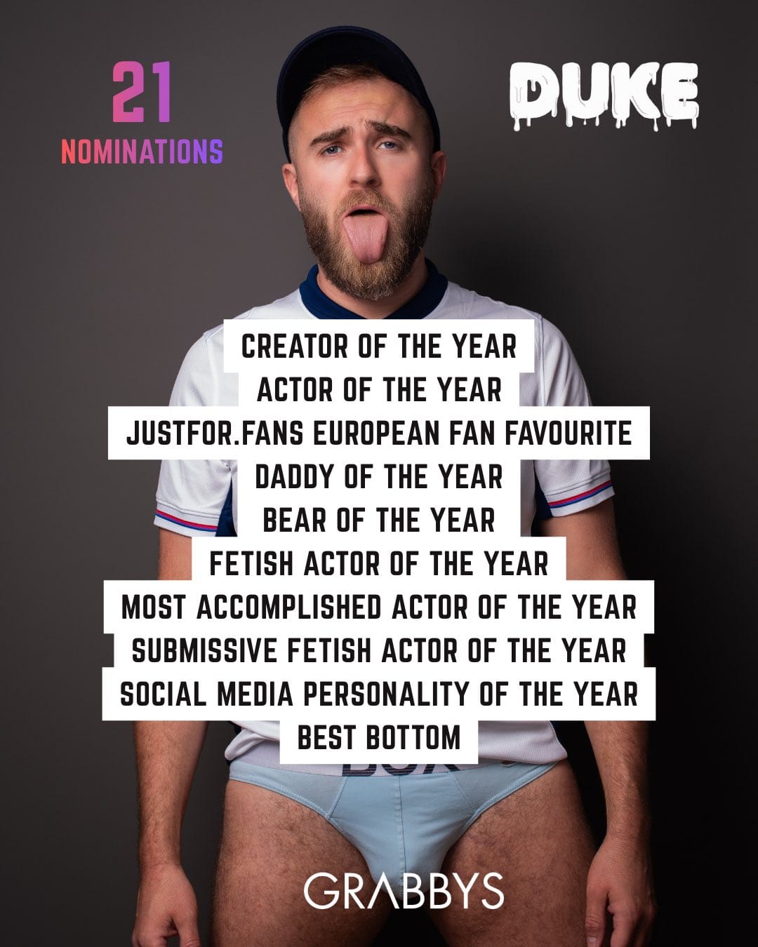 Duke is nominated for 21 Grabby Awards this year, including: