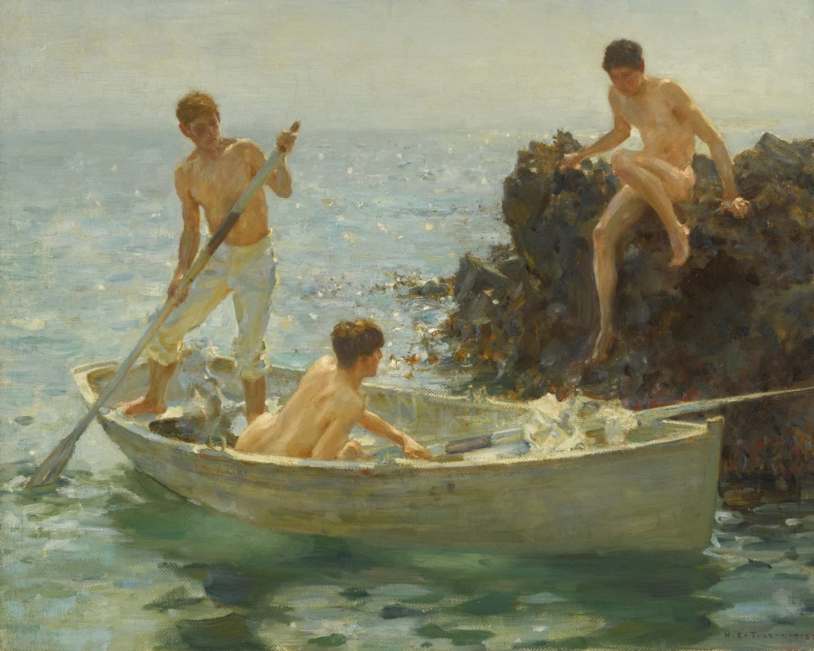In Falmouth, Tuke focused on maritime scenes and portraits, which showed boys and young men bathing, fishing and sunbathing on sunny beaches.