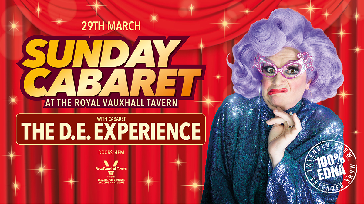 SUNDAY CABARET WITH THE D.E. EXPERIENCE SUNDAY 29TH MARCHSunday Cabaret at The RVT is always something special, and this week we are thrilled to welcome to their spiritual home, the one and only D.E. Experience. There’s no one quite like Edna, an extraordinary performer, unlike anyone else you’ve ever seen, with outrageous laughs and big songs and today you get 100% Edna, unfiltered and uncensored. THERE WILL BE TICKETS ON THE DOOR FROM 4PM ON THE DAYDoors are at 4pm, Edna will be on at 5.45pmWith DJ Simon Le Vans This event is 18+Advance tickets are £10 plus booking fee. No Refunds.PLEASE NOTE: This event will be mostly standing with only a very few seats in the venue, first come first serve. If you have access questions please contact dave@vauxhalltavern.com. ALL BAGS AND COATS MUST BE CHECKED IN TO CLOAKROOM DANCING ON THE STAGE IS AT YOUR OWN RISK The RVT is an LGBTQ+ venue, please respect our space. No hen/stag parties