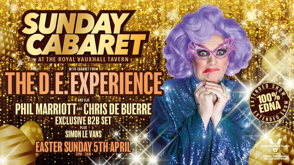 SUNDAY CABARET WITH THE D.E. EXPERIENCE PLUS DJS PHIL MARRIOTT AND CHRIS DE BUERRESUNDAY 5TH APRIL 5PM TO 3AMIt’s the first Bank Holiday weekend of the year and it’s going to be EGGScellent. Easter Sunday at The Royal Vauxhall Tavern is always a big one, and we are excited to confirm that the cabaret today will be provided by the icon that is The D.E. Experience. There’s no one quite like Edna and this will be a sensational show, big songs, inappropriate laughs and lots of both, plus there’s the best Bank Holiday party anthems, from DJs Phil Marriott and Chris De Buerre, playing B2B after Edna right through until 3am. THERE WILL BE TICKETS ON THE DOOR FROM 5PM ON THE DAYDoors are at 5pmWith DJ Simon Le Vans This event is 18+Advance tickets are £20 cabaret and club from 5pm till 3amLimited number of club only tickets for £10, (admission from 9pm only) Both plus booking feeNo Refunds.PLEASE NOTE: This event will be mostly standing with only a very few seats in the venue, first come first serve. If you have access questions please contact dave@vauxhalltavern.com. ALL BAGS AND COATS MUST BE CHECKED IN TO CLOAKROOM DANCING ON THE STAGE IS AT YOUR OWN RISK The RVT is an LGBTQ+ venue, please respect our space. No hen/stag parties