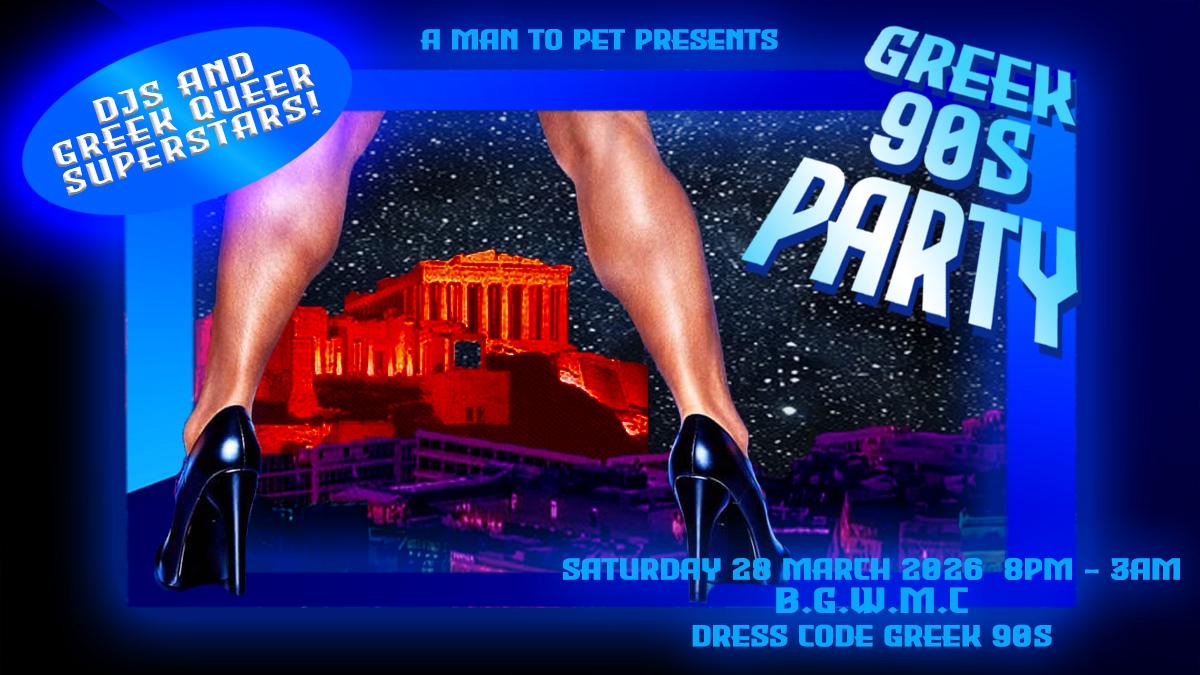 A Man To Pet presents….🇬🇷 GREEK 90’s QUEER PARTY. 🇬🇷 One night only at The Bethnal Green Working Men’s Club will be transformed into Greek 90’s Rave/Bouzoukia. A MAN TO PET who is the ambassador of the Greek HOMOgenia in London and not only decided and Plan to make you all travel back to the past. A decade that most of you was born… THE 90’S. . A Man to Pet has scoured the Aegean islands Myconos,Lesvos and the greek mainland to bring you a one night only extravaganza at queer cabaret Mecca, at The Bethnal Green Workin Men’s Club. Dress as your parents,aunties,uncles older cousins or any kind of greek 90’s theme you like we wont judge you. Maybe Pet will……