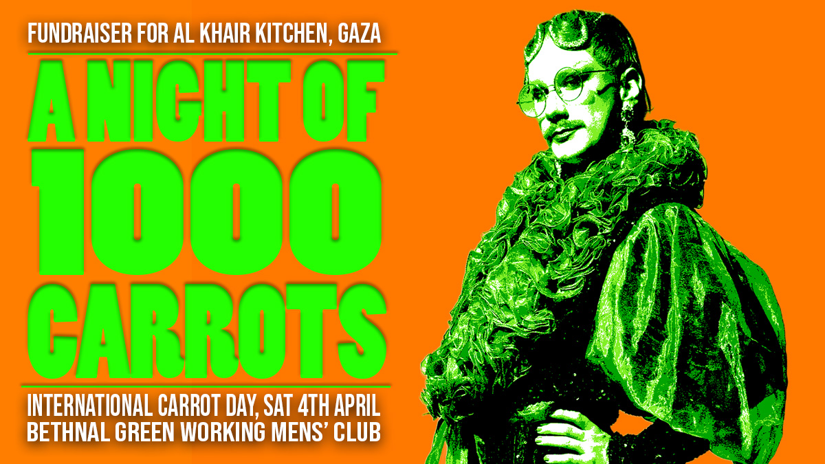 A NIGHT OF 1000 CARROTSKeep calm and carrot on.It’s International Carrot Day and to celebrate we are throwing a HUGE CARROTY PARTAY. . . DJs all night long spinning camp queer pop tunes with carrot-flavoured infusions, plus a lineup of vitamin rich performers popping up on stage throughout the night. Win your very own haul at the veggie tombola - or perhaps on stage in one of the carrot-themed games. Never has there been a better time to be ginger. All hosted by the UK’s premiere drag vegetable, the icon that is Carrot - celebrating their 8th year of performing. They’ll be the chanteuse of your dreams, hosting you into a carrot-fuelled fever dream of laughter and campery.There is only one STRICT RULE - the dress code is: carrot.Dress in carrot couture, dig out your finest orange garms, wear a stupid carrot costume… or perhaps dress as an iteration of Carrot themselves. Those who aren’t dress sufficiently carroty will be publicly shamed.OUR DELICIOUS LINEUP WILL INCLUDE CARROTINE DITTIES FROM:LuspindaKaimaFabio LezonliNat FunniDolly TrolleyDosa CatCabbage… wayyyyy more than your 5-a-day. With superstar DJs tba very soon…All profits from this night will go to funding the work of the AL Khair Kitchen in Khan Younis, Gaza - providing food for starving displaced people affected by the ongoing genocide. See more info at their instagram here: instagram.com/alkhairkitchen2026/TICKETSTickets listed on outsavvy are PWYC, with a minimum of £10. On ticket tailor you have the option of paying £10, £15 or £20. If you have a regular wage and/or spare income, do consider paying more for your ticket. The money will make a real life and visible difference to people on the ground in Gaza.ACCESS AND AOBAll access info about the Bethnal Green Working Mens’ CLub can be found here: https://workersplaytime.net/documents/BGWMCACCESSIBILITYDOCUMENT.pdfDon’t hesitate to get in touch with any questions. This show is running a NOTAFLOF (not turned away from lack of funds) scheme. If you want to attend this event but are struggling to pay, please email carrotdrag@gmail.com with the subject line ‘NOTAFLOF’ and including the name you’d like the ticket under and we will sort it for you - no questions asked or explanations needed.Please note this show is a safe space for all LGBTQ+ people and allies - come as you are, and you will be celebrated. However, transphobia, homophobia, racism, ableism, misogyny or any other form of hate speech will not be tolerated under any circumstances - and we reserve the right to ask disrespectful audience members to leave without refund. If you are unsure of anyone’s pronouns, please use they/them. If you are not a member of the LGBTQ+ community, or bringing someone who is not with you, please be aware this is a queer event and you must treat the space, fellow patrons and performers with respect.