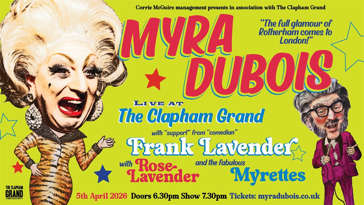 SUNDAY 5TH APRIL / DOORS & BARS OPEN 6.30PM / SHOW STARTS APPROX ONE HOUR AFTER / 18+MYRA DUBOIS; the acid-tongued comedic force of nature returns to THE CLAPHAM GRAND this April. Join the self-styled ‘Siren of South Yorkshire’ for her signature quick-wit and un-rivalled crowd work. With ‘support’ from ‘comedian’ Frank Lavender & more special guests TBA.